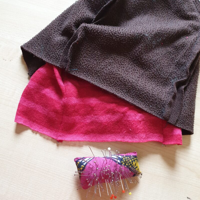 – Plier le tissu en deux endroit contre endroit dans le sens horizontal du tricot s’il s’agit d’un tricot, dans le droit fil ou le contre fil s’il s’agit d’un tissé