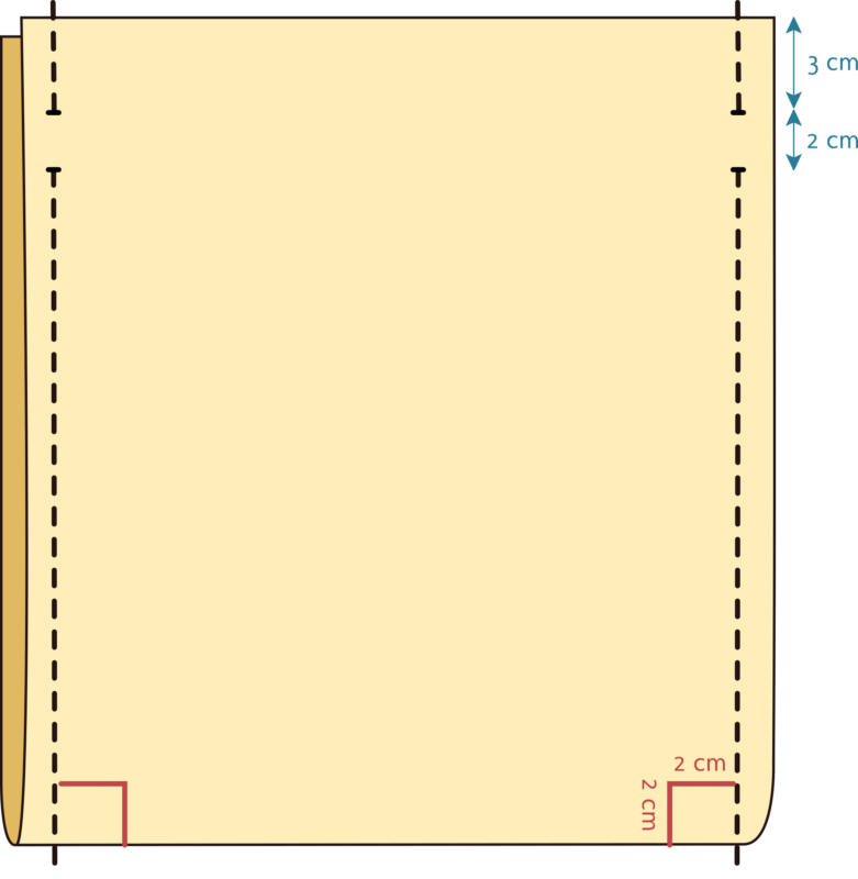 • Plier le tissu en deux, endroit contre endroit et couper aux dimensions indiquées ci-dessus ou aux dimensions souhaitées (en incluant la valeur de couture).