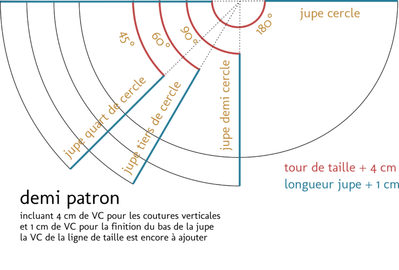 | jupe cercle | (tour de taille + 4 cm) / 2π | petit rayon + longueur de la jupe + 1 cm | 180° |