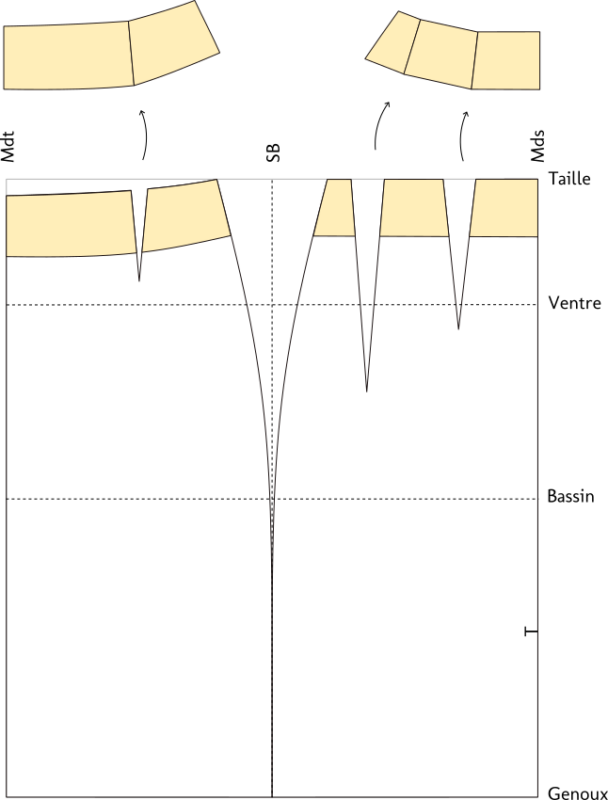 - Qu’il s’agisse d’une ceinture ou d’une enforme, on ne souhaite pas créer d’épaisseur en réalisant des pinces dans le tissu, comme on le fait dans la jupe elle-même.