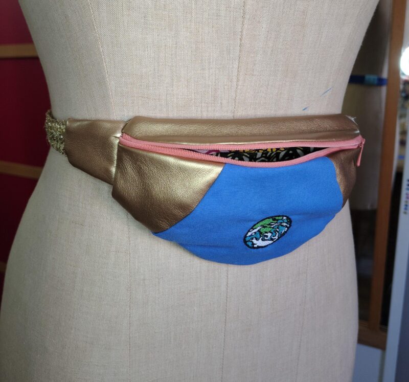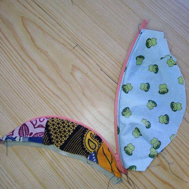 - Épingler les deux faces sur l’arrondi du bas de la banane. Selon la largeur de la tirette, il ne peut qu’il y ait un petit décalage. Ce n’est pas grave, ce qui compte c’est que la tirette soit bien à plat.