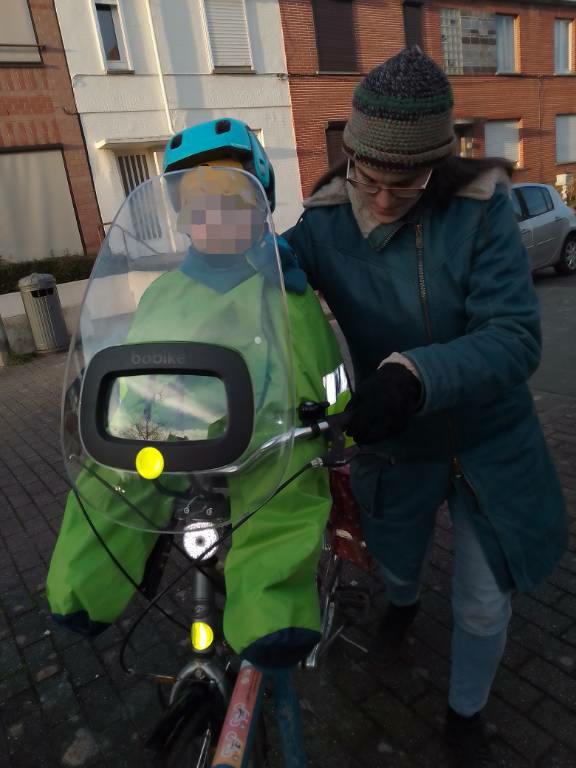 L’UPcyclette s’enfile très rapidement sur le siège vélo, avant ou après que l’enfant y soit installé.e. Entre les trajets, elle peut donc être laissée sur le siège être retirée, selon le lieu où est garé le vélo.